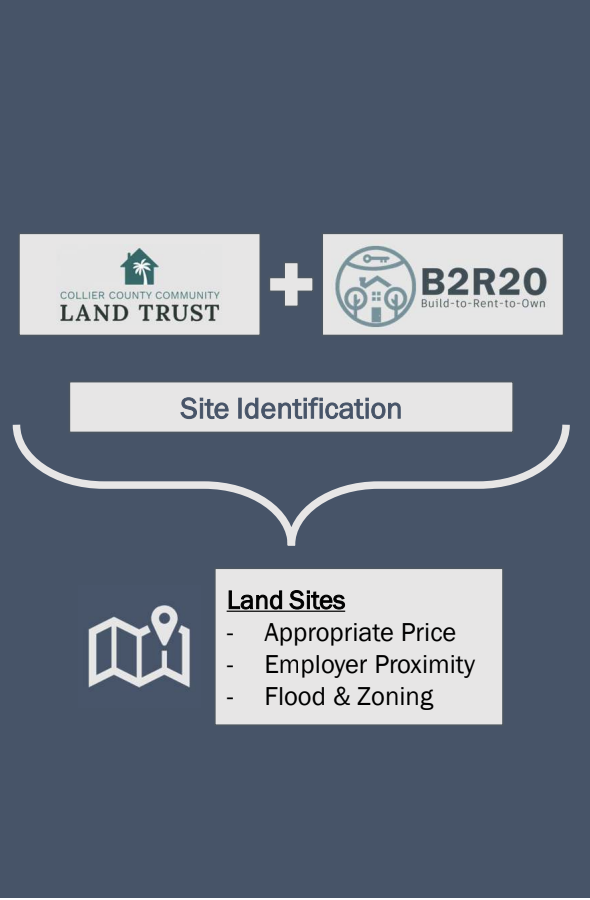 We identify and acquire land sites in Collier County that are suitable for workforce housing. We prioritize parcels that are under- or undeveloped, within proximity to major employers, and meet key criteria such as zoning compatibility, flood safety, and affordability. Site partnerships are often formed with the Collier County Community Land Trust (CCCLT).