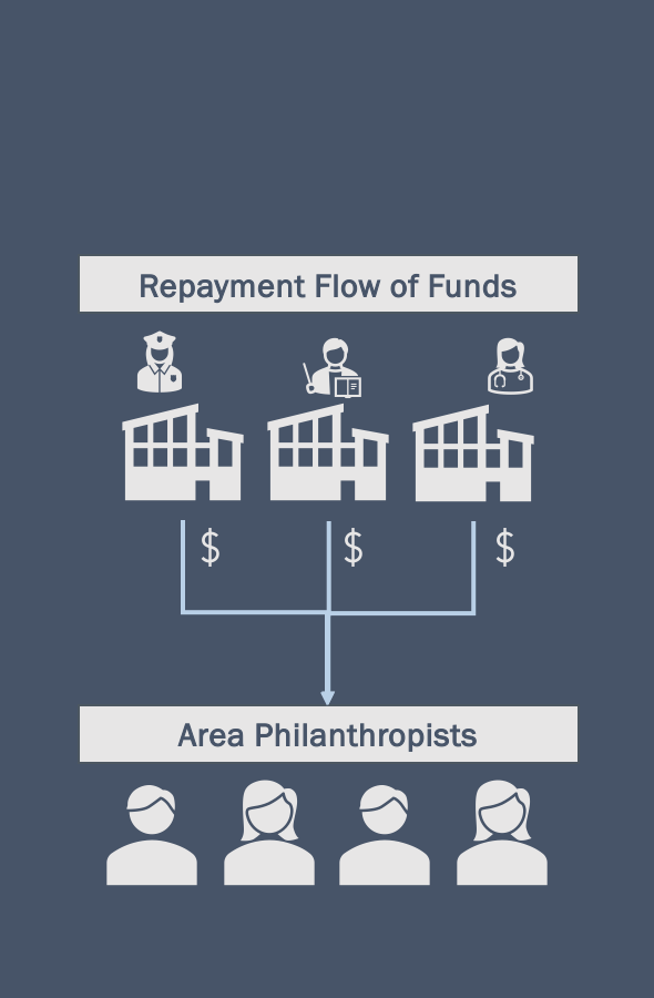 We raise project capital from area philanthropists through recoverable grants, zero- or low-interest loans, and other program-related investments. This capital structure, available exclusively to non-profits, enables repayment and recycling of funds into future projects.